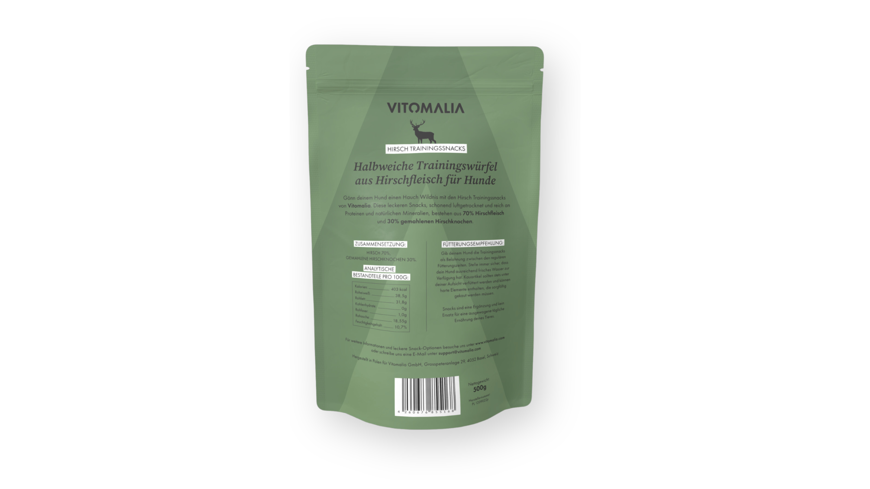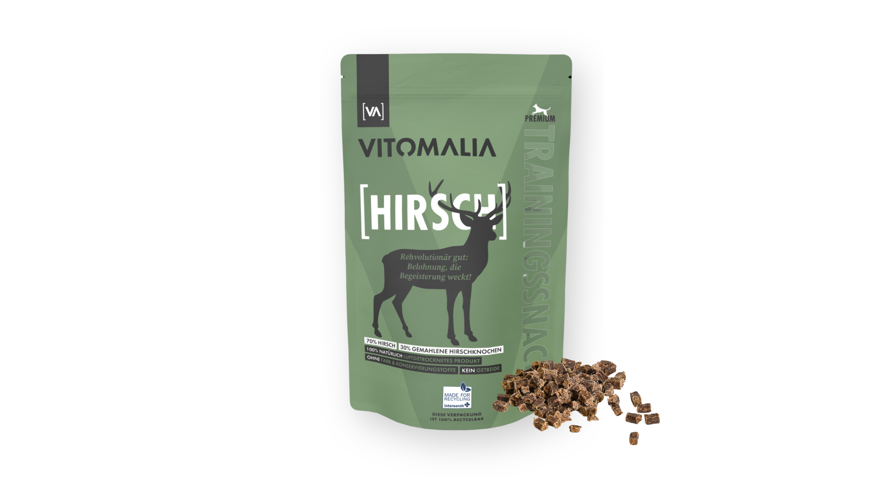 Vitomalia Training Treats have been specially developed for dog training: small, soft cubes that your dog eats quickly and whose intense scent immediately increases attention - perfect for recall, clicker training and structured rewards in everyday life.