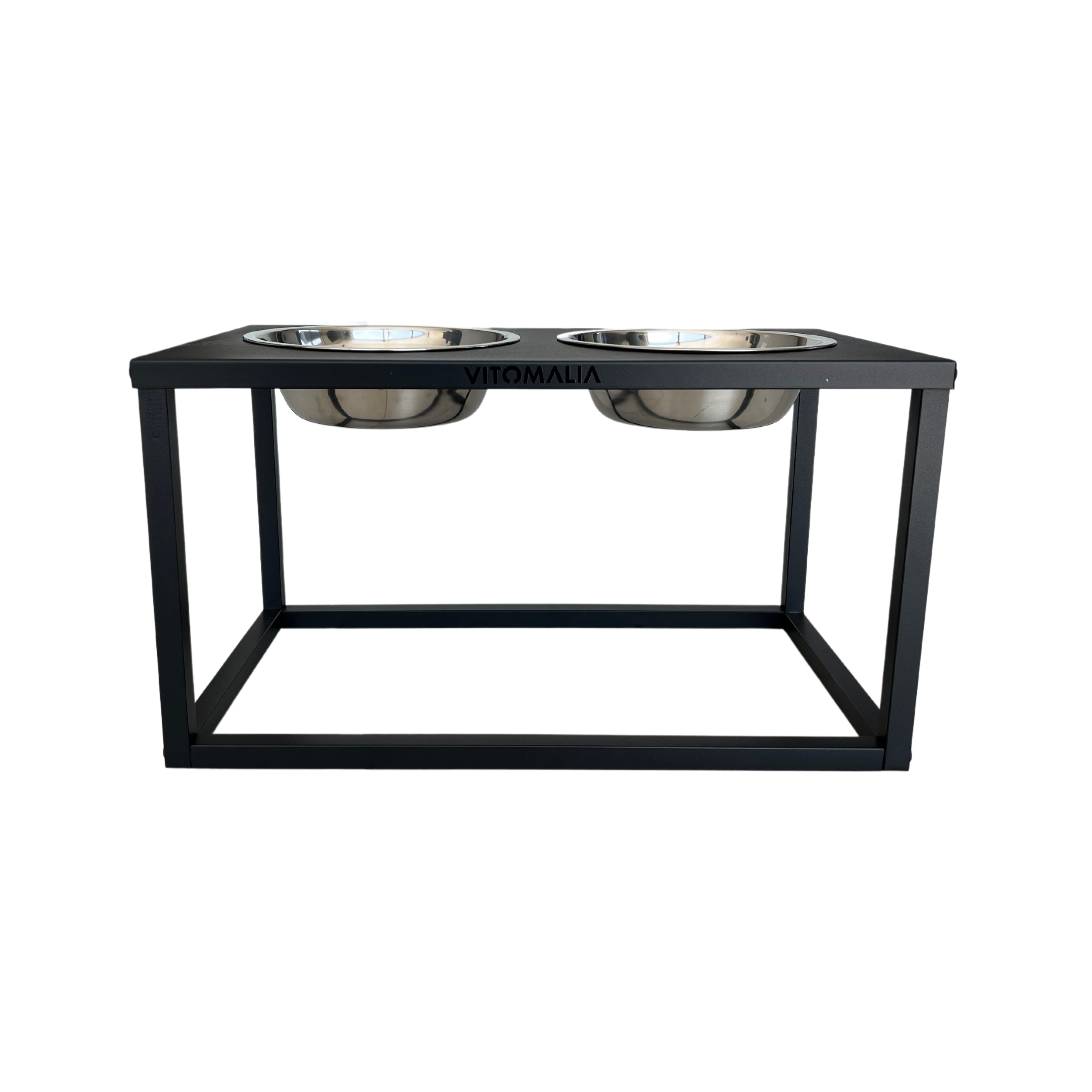 The Luxus Edition dog Feeding Station is a powder-coated 2-bowl holder with two stainless steel bowls. The two bowls have a diameter of Ø 22 cm (= 1.5 litres). A total of two stainless steel bowls are supplied with the Feeding Station. The rubber on the edge of the bowl holes ensures that the bowls do not slip and cannot be heard loudly on the holder.