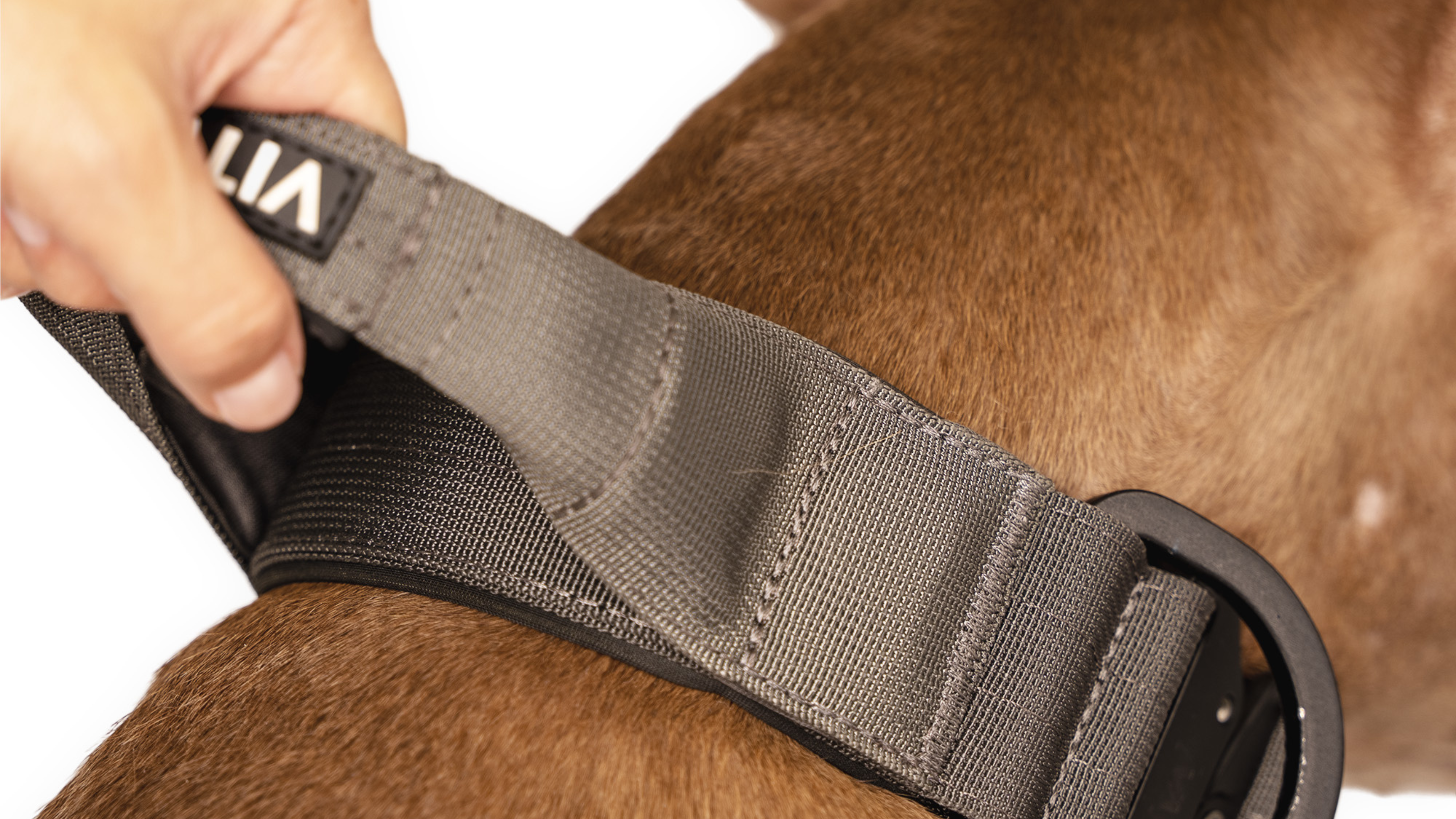 El asa magnética especialmente desarrollada queda plana sobre el Collar y puede agarrarse a la velocidad del rayo en situaciones peligrosas. Gracias a sus potentes imanes, se mantiene en su sitio sin estorbar al correr o jugar. Acolchada en el interior, protege la palma de la mano incluso cuando se tira con fuerza de ella.