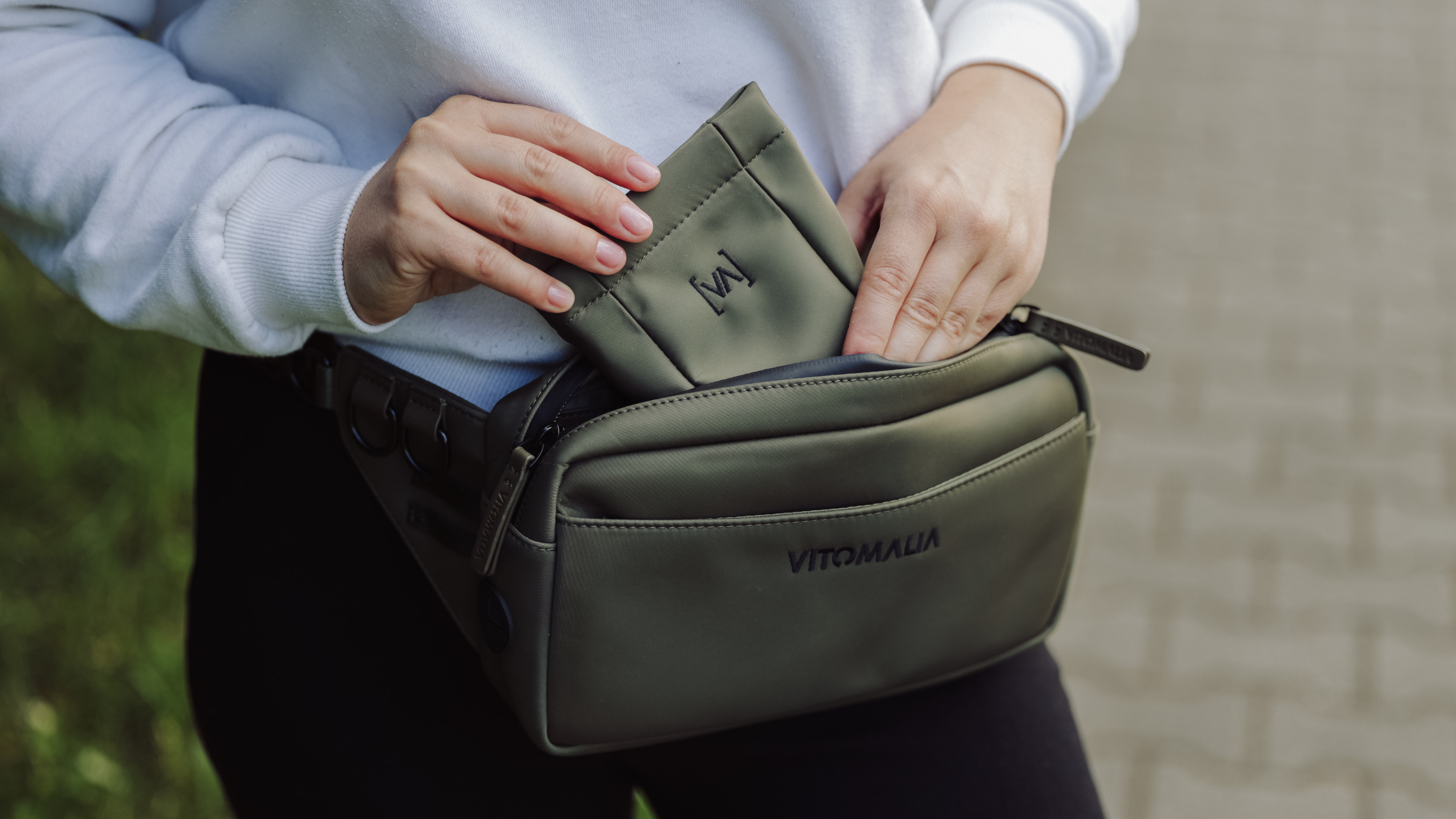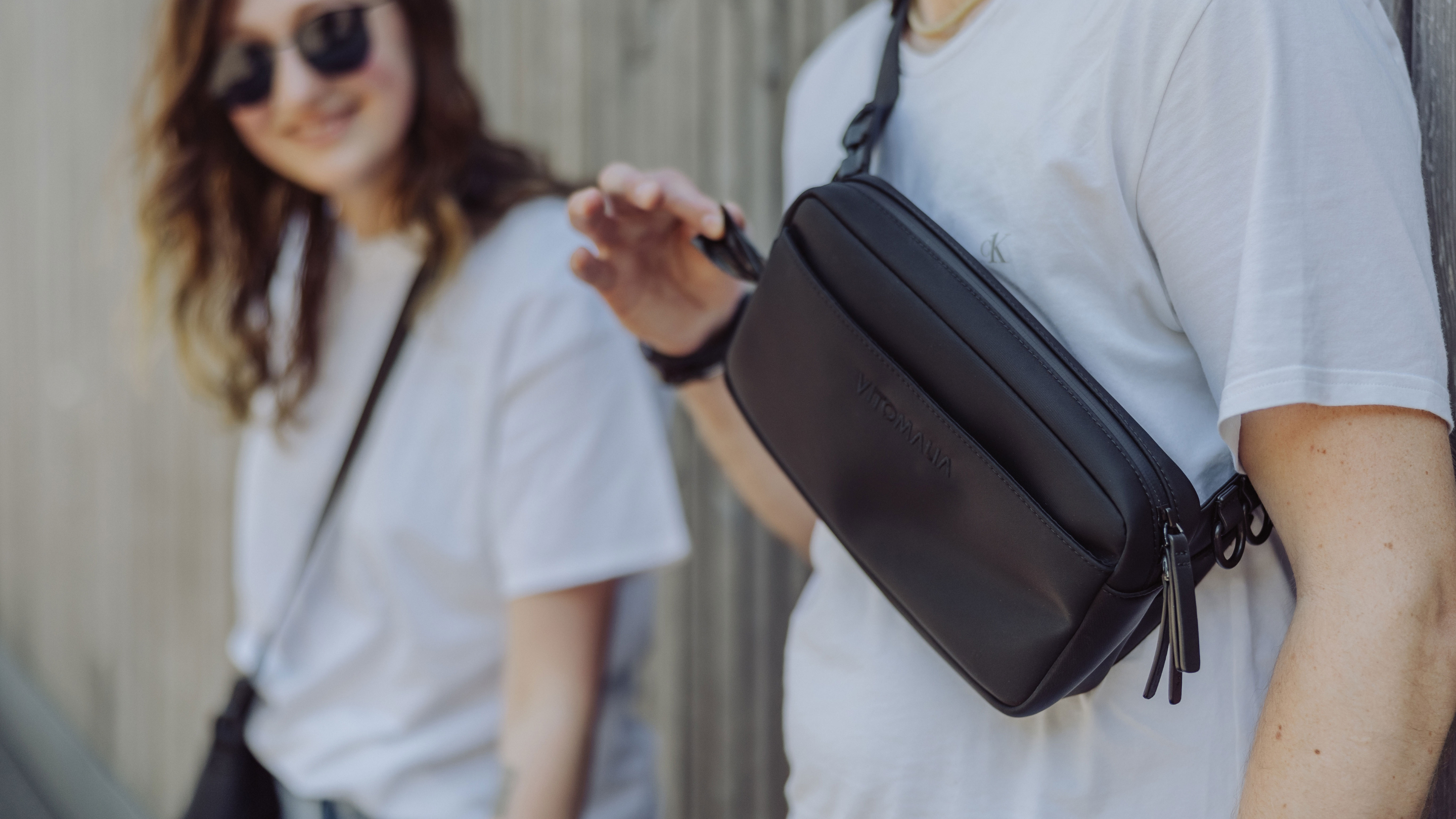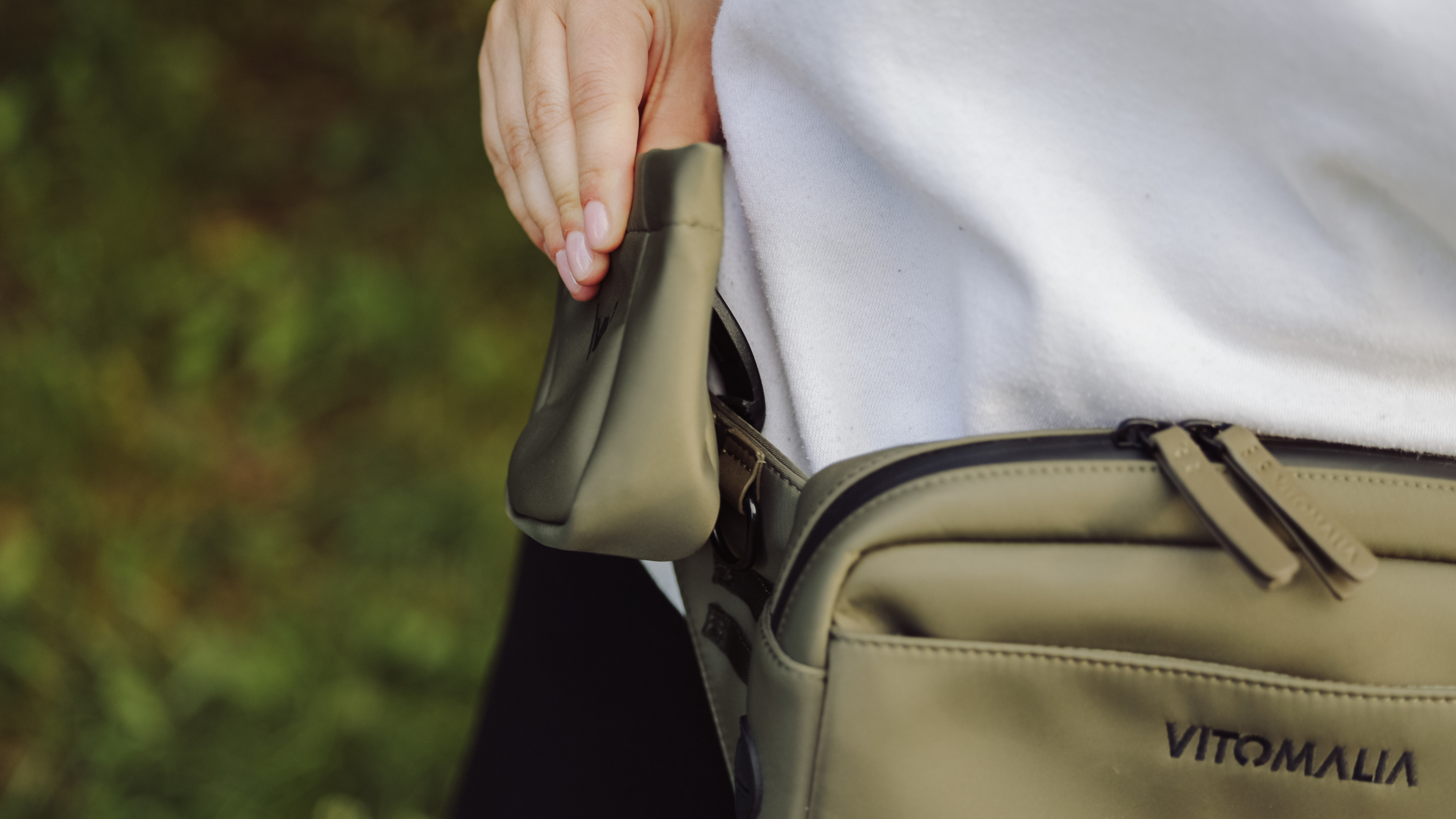 Mit ca. 25 × 15 × 6 cm bietet die Tasche kompakten, aber durchdachten Stauraum. Der Gurt ist von etwa 60 bis 140 cm verstellbar und erlaubt das Tragen als Bauchtasche oder Crossbody.
